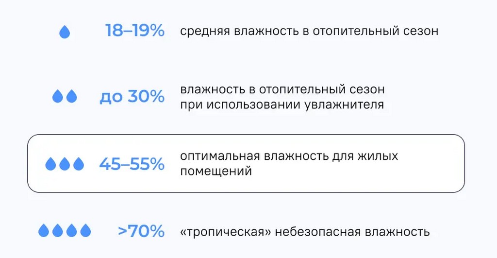 Влажность в детской комнате немного отличается.Детский организм нуждается в особенно нежном и деликатном окружении. Дети больше страдают от недостатка или переизбытка влажности, а потому регулировать микроклимат в детской комнате крайне важно. Оптимальная влажность для детской — 50–60%. При меньшей влажности, даже если она соответствует стандартам ГОСТ, у ребёнка начинают пересыхать слизистые, носоглотка. Такая норма должна поддерживаться в любое время года — и зимой, и летом.