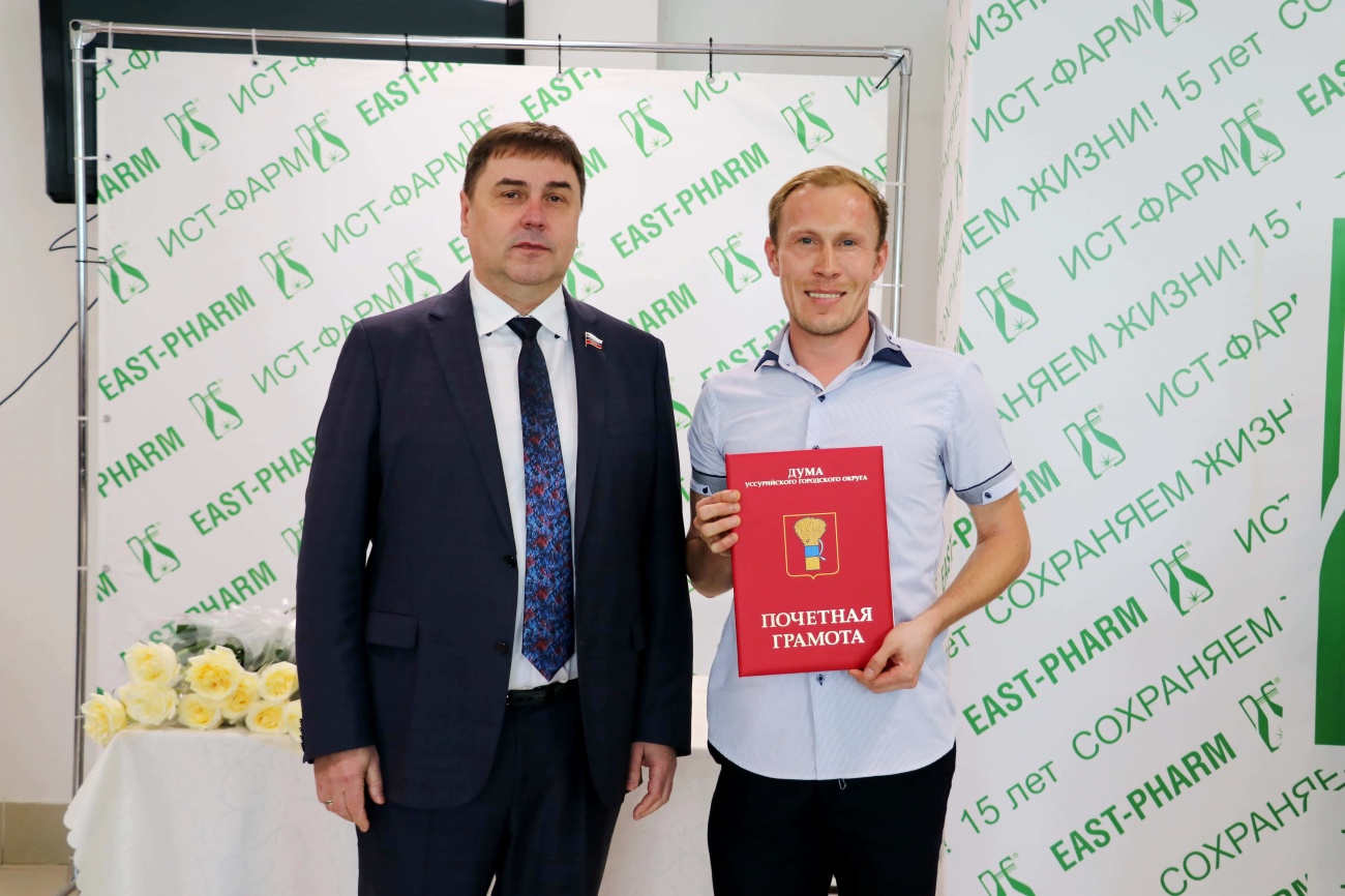 С торжественной датой работников предприятия по производству лекарственных препаратов «Ист-Фарм» поздравил председатель Думы Уссурийского городского круга Александр Черныш. Особо отличившихся работников завода он наградил Почетными грамотами, Благодарностями Думы и администрации.