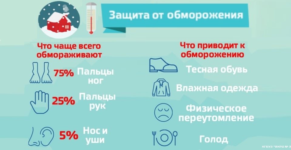 — не пейте спиртного — алкогольное опьянение (впрочем, как и любое другое) на самом деле вызывает большую потерю тепла (в связи с расширением периферических сосудов), в то же время вызывая иллюзию согревания. Дополнительным фактором является невозможность сконцентрировать внимание на признаках отморожения; — не курите на морозе — курение уменьшает периферийную циркуляцию крови, и таким образом делает конечности более уязвимыми; — не ходите в морозную погоду по улице голодным, уставшим; — нельзя гулять при морозе после травм, кровопотерь; — носите свободную одежду — это способствует нормальной циркуляции крови; — одевайтесь как «капуста» — при этом между слоями одежды всегда есть прослойки воздуха, отлично удерживающие тепло; — верхняя одежда обязательно должна быть непромокаемой; — тесная обувь, отсутствие стельки часто служат основной предпосылкой для появления отморожения. Особое внимание уделять обуви необходимо тем, у кого часто потеют ноги. В сапоги нужно положить теплые стельки, а вместо хлопчатобумажных носков надеть шерстяные — они впитывают влагу, оставляя ноги сухими; — не выходите на мороз без варежек, шапки и шарфа. Лучший вариант — варежки из влагоотталкивающей и непродуваемой ткани с мехом внутри. Перчатки же из натуральных материалов хоть и удобны, но от мороза не спасают. Щеки и подбородок можно защитить шарфом; — в ветреную холодную погоду перед выходом на улицу открытые участки тела смажьте специальным кремом, салом или животным маслом (но не растительным!); — не носите тяжелых предметов (сумок, корзин и тому подобное), которые сдавливают сосуды, в частности рук, что способствует замерзанию; — не пользуйтесь увлажняющим кремом для лица и рук; — не носите на морозе металлических (в том числе золотых, серебряных) украшений — колец, серёжек и т. д. Во-первых, металл остывает гораздо быстрее тела до низких температур, вследствие чего возможно «прилипание» к коже с болевыми ощущениями и холодовыми травмами. Во-вторых, кольца на пальцах затрудняют нормальную циркуляцию крови. Вообще на морозе старайтесь избегать контакта голой кожи с металлом; — пользуйтесь помощью друга — следите за лицом друга, особенно за ушами, носом и щеками; — не позволяйте отмороженному месту снова замерзнуть — это вызовет куда более значительные повреждения кожи; — не снимайте на морозе обувь с отмороженных конечностей — они распухнут, и вы не сможете снова надеть обувь. Необходимо как можно скорее дойти до теплого помещения. Если замерзли руки — попробуйте отогреть их под мышками; — вернувшись домой после длительной прогулки по морозу, обязательно убедитесь в отсутствии отморожений конечностей, спины, ушей, носа и т. д; — как только на прогулке вы почувствовали переохлаждение или замерзание конечностей, необходимо как можно скорее зайти в любое теплое место — магазин, кафе, подъезд — для согревания и осмотра потенциально уязвимых для отморожения мест; — если у вас заглохла машина вдали от населенного пункта или в незнакомой для вас местности, лучше оставаться в машине, вызвать помощь по телефону или ждать, пока по дороге пройдет другой автомобиль; — прячьтесь от ветра — вероятность отморожения на ветру значительно выше; Следует учитывать, что у детей теплорегуляция организма еще не полностью настроена, а у пожилых лю