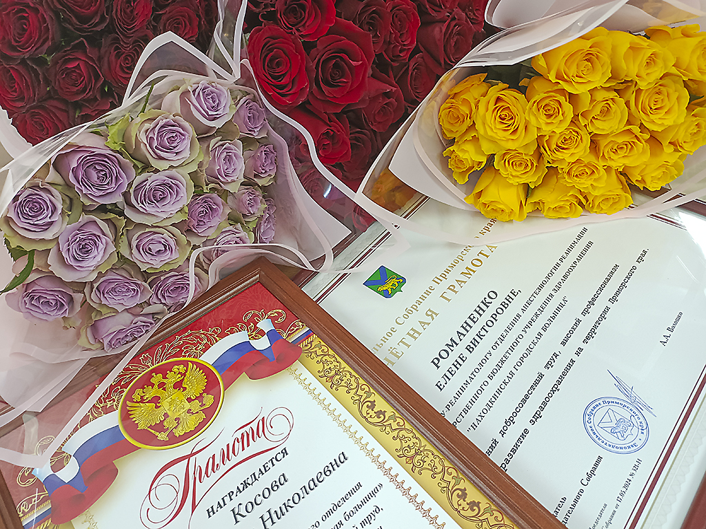 Особо отличившимся работникам больницы в канун профессионального праздника вручили ведомственные награды, Почетные грамоты и Благодарственные письма больницы, Законодательного собрания края, администрации и думы Находки, краевой организации профсоюза работников здравоохранения Приморья.