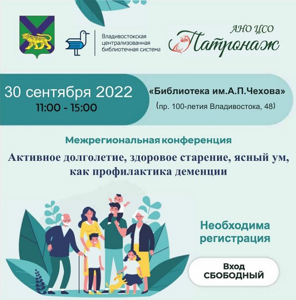 Во Владивостоке состоится межрегиональная конференция «Активное долголетие, здоровое старение, ясный ум как профилактика деменции». В качестве экспертов выступят специалисты медицинских и социальных учреждений. Мероприятие пройдет 30 сентября в Центральной библиотеке имени А. П. Чехова. Вход свободный, но необходима регистрация, сообщает портал VladMedicina.ru.