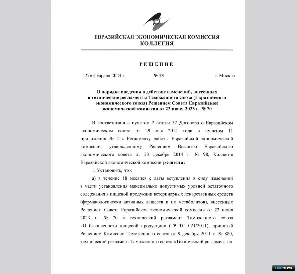 Коллегия Евразийской экономической комиссии утвердила порядок введения в действие изменений, внесенных в техрегламенты в сфере безопасности пищевой продукции — ТР о безопасности пищевой продукции, о безопасности молока и молочной продукции, рыбы и рыбной продукции и других. Речь идет о поправках, предусмотренных Решением Совета ЕЭК от 23 июня 2023 г. № 70. Поправки касаются регулирования остаточного содержания в пищевой продукции ветеринарных лекарственных препаратов (фармакологически активных веществ и их метаболитов) — в том числе в пищевой продукции аквакультуры. Июньское решение совета вступает в силу с 10 июля 2024 г.