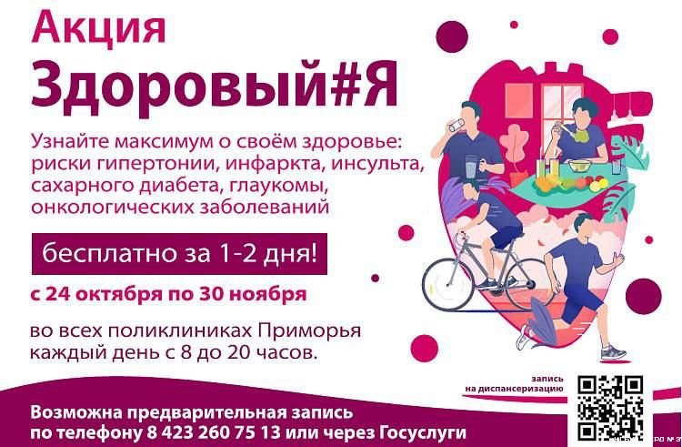 В Приморье за первую неделю акции «Здоровый#Я» обследование здоровья прошли более 6 тысяч человек. В выходные дни все поликлиники края также готовы принимать жителей с 8.00 до 20.00. Записаться можно через Госулуги, по телефону поликлиники или подойти без записи.
